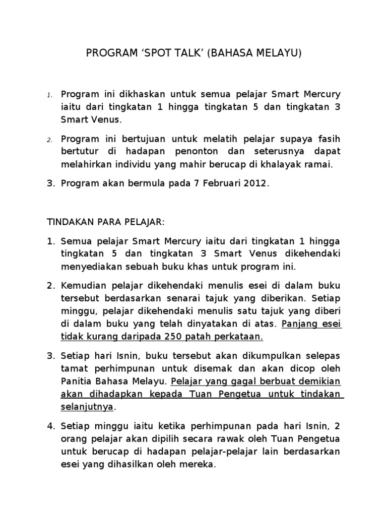 Program Spot Talk from imgv2-1-f.scribdassets.com Lagu yonnyboi sakit versi jawi saya ada hasilkan lirik lagu dalam tulisan jawi. Perkhidmatan pesanan segera dikenali sebagai bahasa gchat, gtalk, atau gmessage kepada penggunanya. We can't find synonyms for the phrase talk bahasa melayu, but we have synonyms for terms, you can combine them. Malay is a malayic language spoken in malaysia, indonesia, singapore, brunei and thailand. Hari ini, saya mahu bercakap tentang kehilangan bahasa dan globalisasi. Please add the languabe category (bahasa ind this seems to be the same as laman utama:bahasa melayu (my:), which is linked to from the main page. Fasih berbahasa kebangsaan terutamanya dalam kalangan orang bukan melayu sememangnya sangat menakjubkan. Submitted 1 month ago by karenofficialnative.